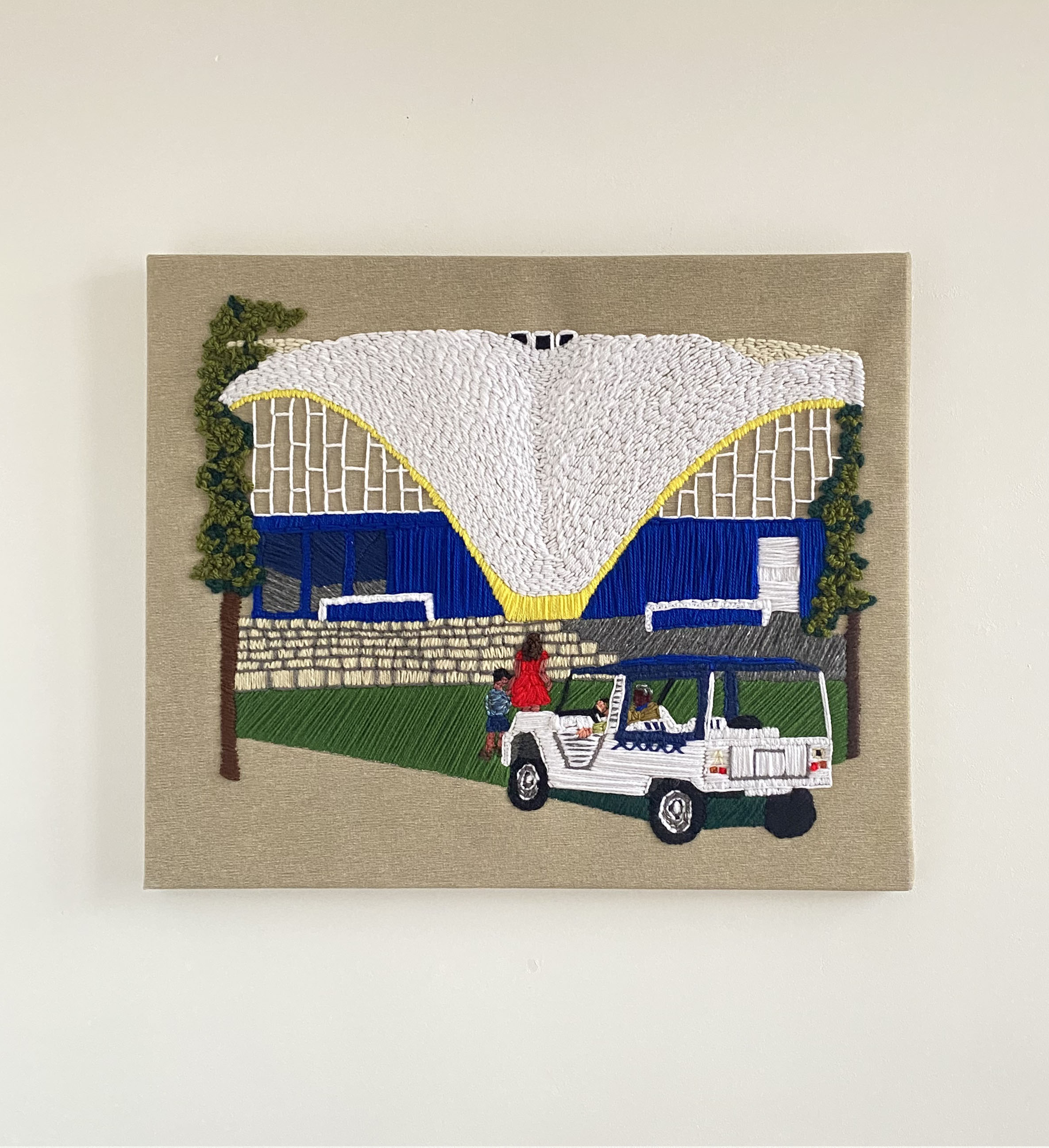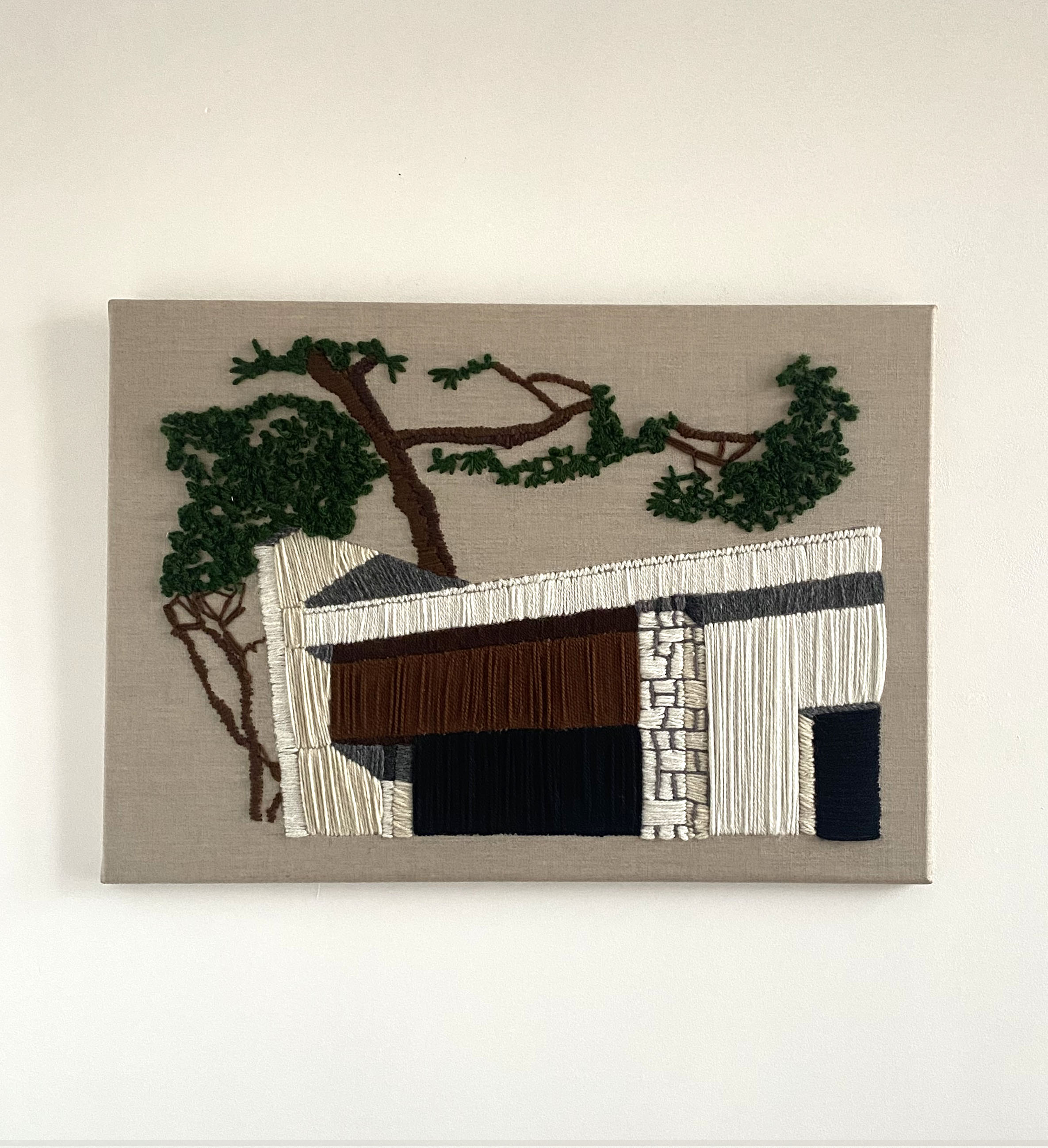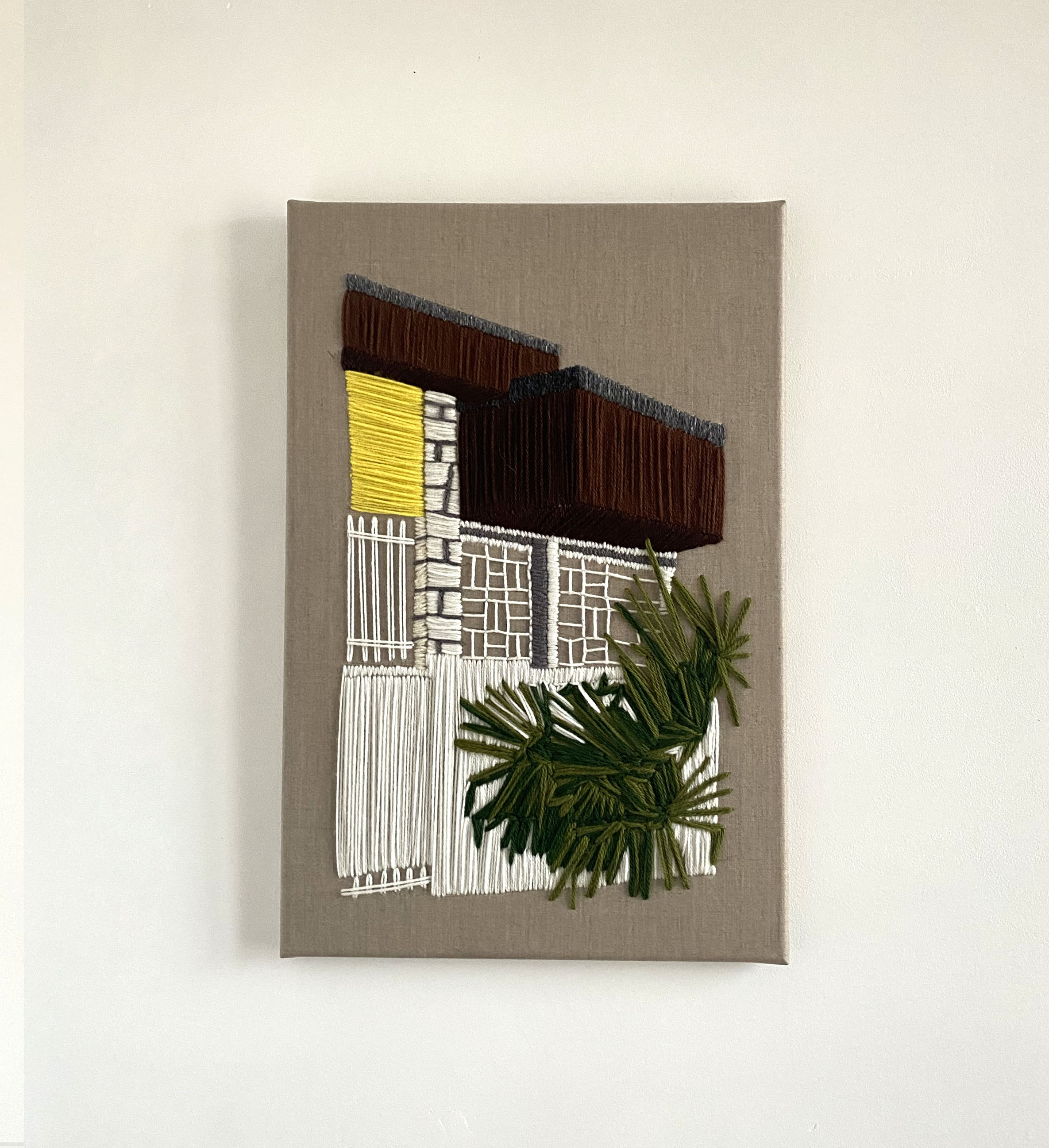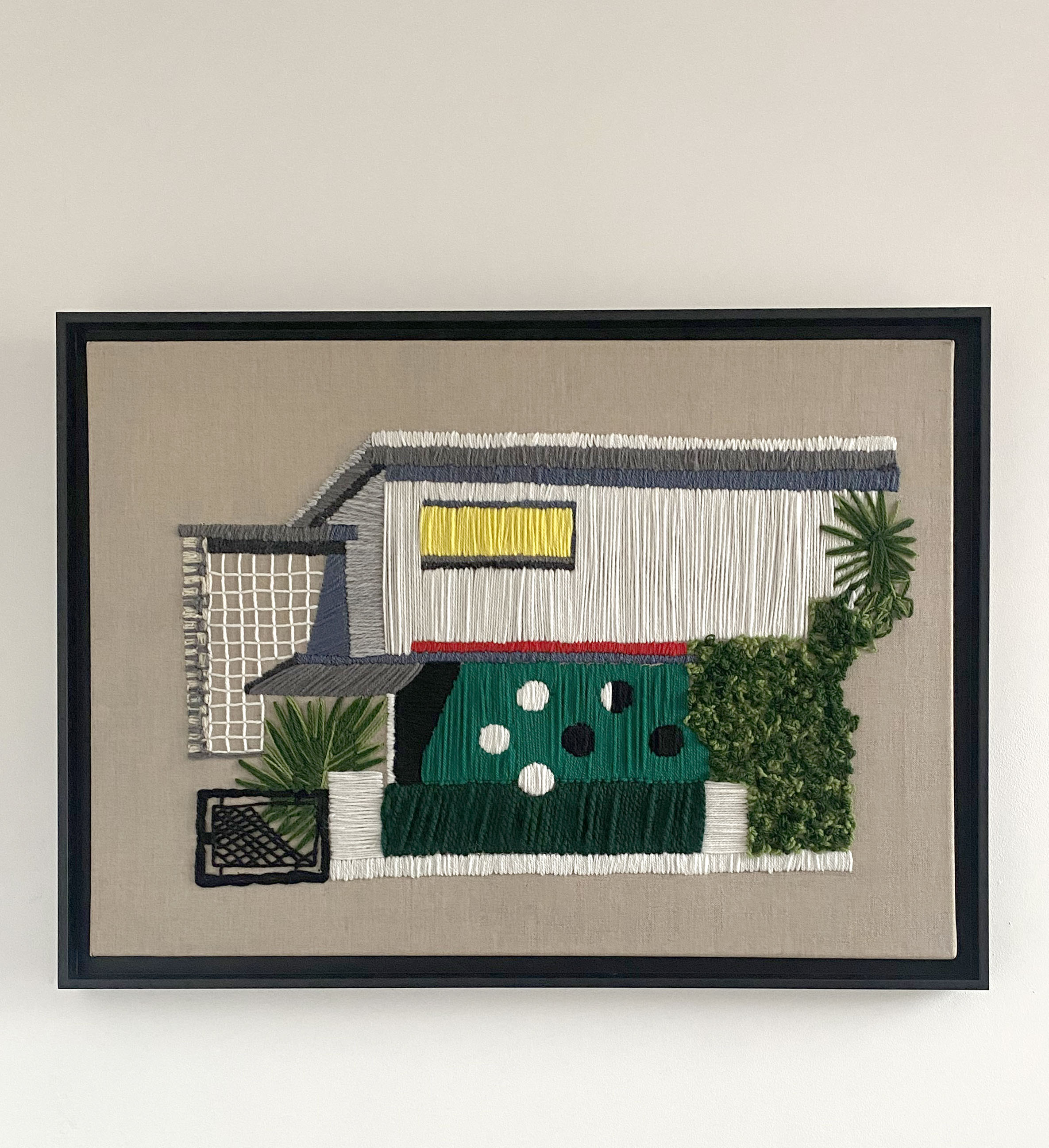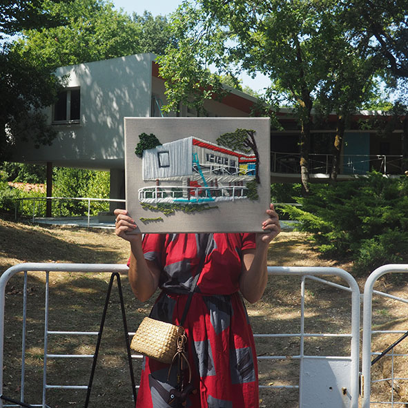 Je m’y suis installée 1 mois pour repérer les villas années 50 puis j’ai réalisé dans mon atelier à Paris une série de tableaux brodés et plus tard des photos en situation avec Julien DONADA.